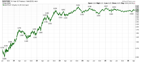 The first is the 10-year U.S. Treasury Yield. After surging from 0.5% in the wake of the COVID outbreak in 2020, it has been rangebound between 3.5% and 5.0% for the last three years since 2023 (higher bond yields, lower bond prices). If the 10-Year U.S. Treasury yield finds itself jumping sustainably above 5%, this is not a good sign. Today, we are at a comfortable 4.25% right smack dab in the middle of the range, so nothing to worry about right now. But just as the S&P 500 can make its way from 6316 to over 7000 in a figurative heartbeat, so too can Treasury yields move at a similar pace.