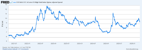 What have we been seeing recently? SInce bottoming in early 2025, credit spreads have been steadily on the rise. Focusing on CCC & Lower US High Yield Index spreads that historically have been the first to show signs of stress that eventually spread to the broader market, we have seen spreads widen from the lows just before 7% at the beginning of last year to above 10% for the first time since the Liberation Day tariff related spikes in spreads took place just over a year ago. We’re currently at the high end of the neutral zone, but if spreads start moving sustainably above 10% or more, we should be prepared for this risk-off sentiment to spread to other more established market segments.