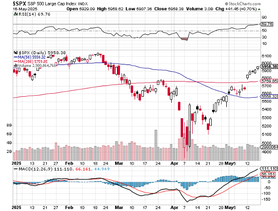 So where does that land us in terms of timing today?  This implies that the S&P 500 could be pressing new all-time highs as soon as around Memorial Day.  Now this timing may be a touch ambitious in the current market, as the S&P 500 is now arriving at overbought levels with a Relative Strength Index (RSI) now effectively at 70.  This implies that we are now overdue for at least a short spell of consolidation before making the final roughly two hundred S&P 500 point push back to new all-time highs.  Nonetheless, the current stock market remains solidly on this encouraging upward trajectory.