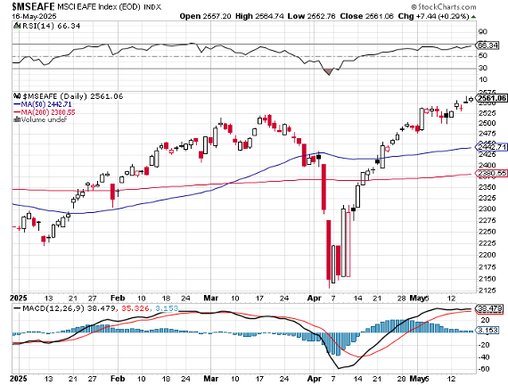 Caravan. It is important to note that the U.S. stock market is not alone in its advance to the upside, as many of its friends across capital markets have already been turning it up.  Leading among the group is developed international stocks as measured by the MSCI EAFE Index, which had been trading at all-time highs as recently as the middle of March before its own correction but has already delivered on the symmetry discussed above – the peak-to-trough correction took roughly three weeks through early April and the subsequently trough-back-to-peak rebound to new all-time highs played out over the three weeks after.