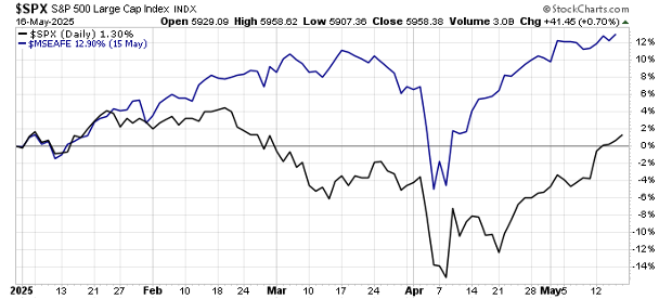 Let’s run with this one a little bit more.  While the S&P 500 has clawed its way back to flat for 2025 on a price basis, developed international stocks have been on a relative moondance virtually all year and are now trading higher by more than +12% on price alone (see below).  Could this non-U.S. outperformance continue for the foreseeable future?  Absolutely, as developed international stocks continue to collectively trade at a 40% discount to their U.S. counterparts at a time when the geopolitical growth and global trade landscape may be in the early stages of shifting at least marginally in favor of the world relative to the U.S. going forward (don’t worry, we’ll likely be exploring this topic A LOT in the coming months).  This isn’t necessary a knock on the U.S., but more a recognition that non-U.S. stocks may finally be getting back in the game after years of languishing.