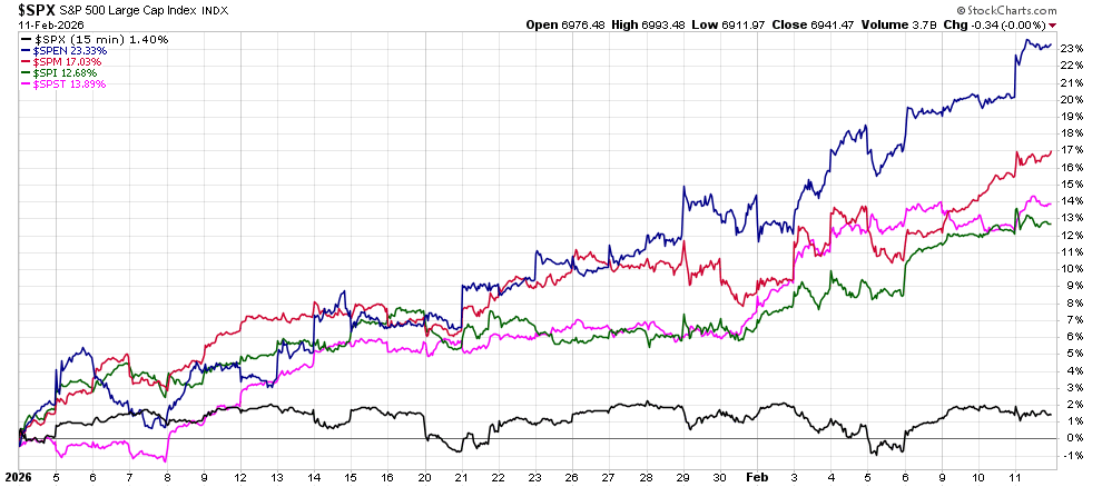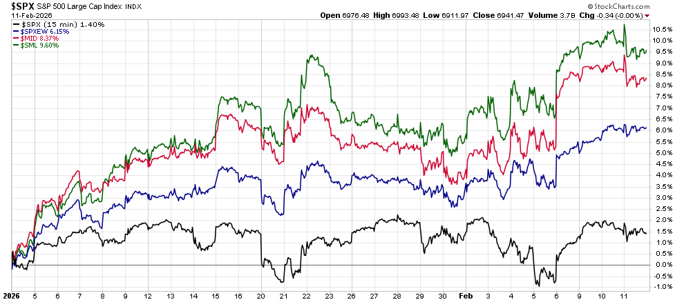 Coming out of my cage.  Has the headline benchmark S&P 500 had a rousing start to 2026?  Not really.  It is only higher by +1.5% year to date and was lower for the year as recently as last week.  But it’s hardly a disaster either.  I mean, if currently clocking at a +12% annualized rate including touching fresh new all time highs through the first six weeks of the year is considered a tough market, I’ll take that kind of turbulence all day long.  Sign me up.